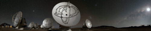 This panoramic view of the Chajnantor plateau shows the antennas of ALMA ranged across the unearthly landscape. Some familiar celestial objects can be seen in the night sky behind them. © B. Tafreshi (ESO)