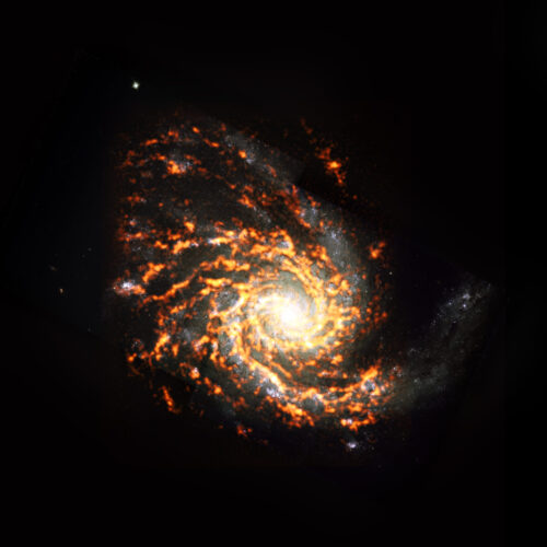 Shown here as an ALMA (orange/red) composite with Hubble Space Telescope (HST) data, NGC4254 was among the nearly 100 galaxies included in the recent PHANGS project census of galaxies in the nearby Universe. The survey found that stellar nurseries within these galaxies vary widely in appearance and behavior, and that these characteristics heavily depend on where the stellar nurseries are located. NGC4254 is an example of a galaxy featuring M type morphology. Credit: ALMA (ESO/NAOJ/NRAO)/PHANGS, S. Dagnello (NRAO)