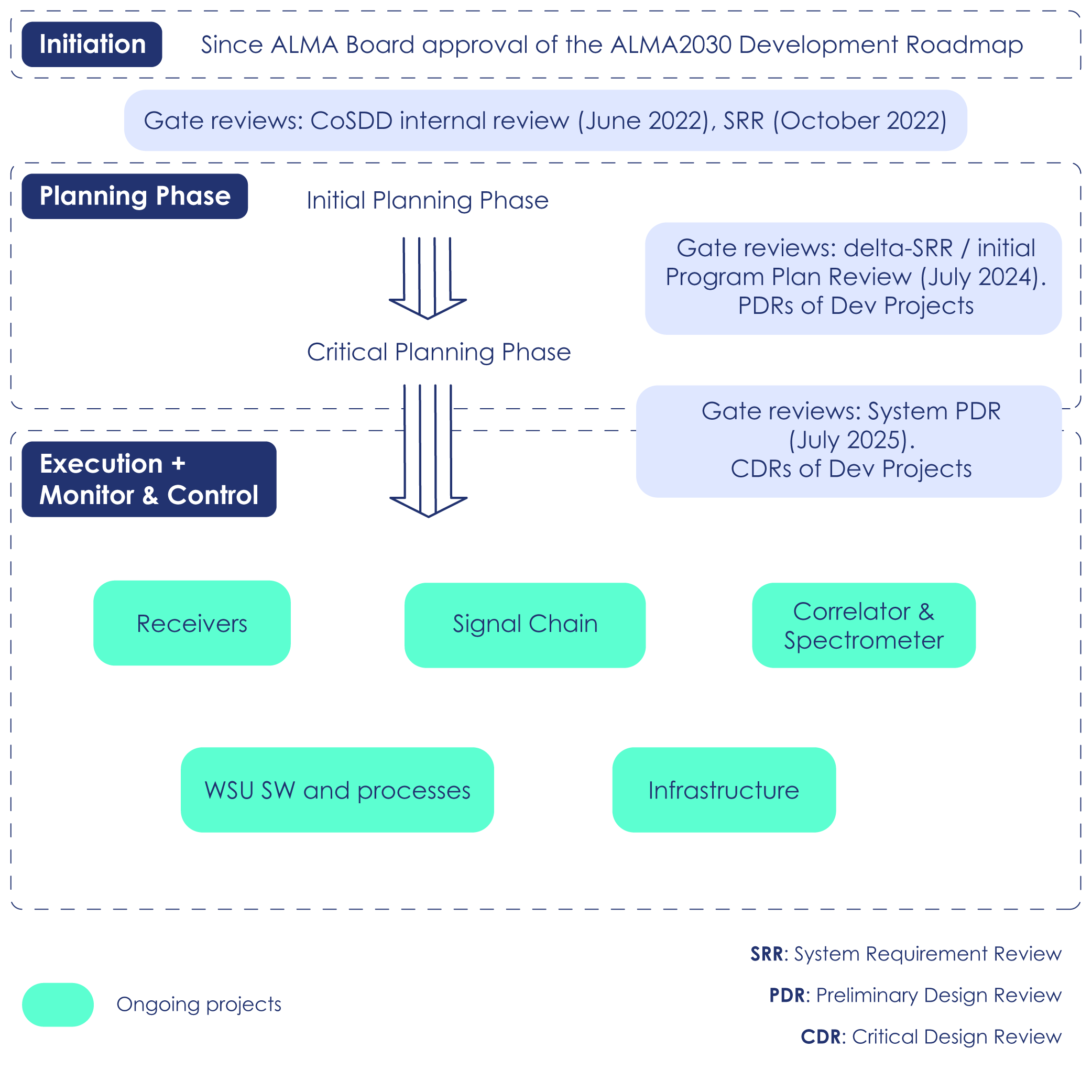 The WSU program began with an initiation phase (2019-2022), during which the observatory and the community evaluated enabling technologies and established top-level goals based on the achievements of previous scientific and technical research. This phase concluded with an initial Conceptual System Design Description (CoSDD), which focused on hardware and updates of the ALMA System Technical Requirements (STR). These efforts laid the groundwork for subsystem development.