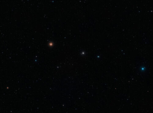 Esta imagen de campo amplio en luz visible de la región del cielo donde se encuentra la remota galaxia NGP-190387 se creó a partir de imágenes del Digital Sky Survey 2. La galaxia, situada tan lejos que su luz tardó más de 12 mil millones de años en llegar hasta nosotros, está cerca del centro de la imagen. Aunque no pueden verse en esta imagen, muchas galaxias más cercanas se pueden observar con una vista de campo amplio.